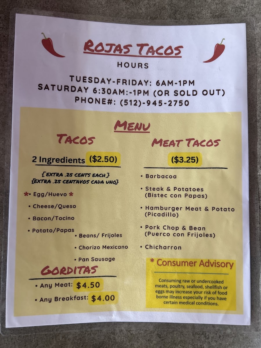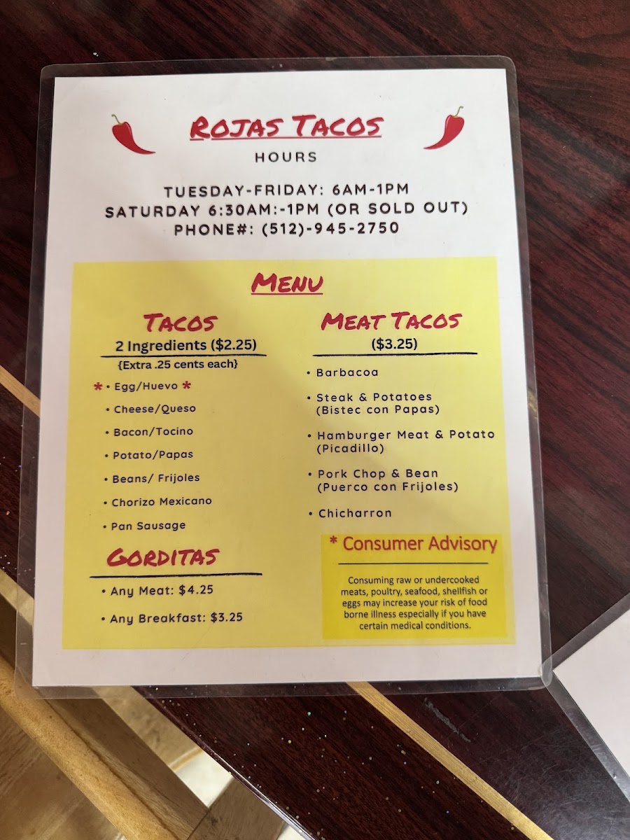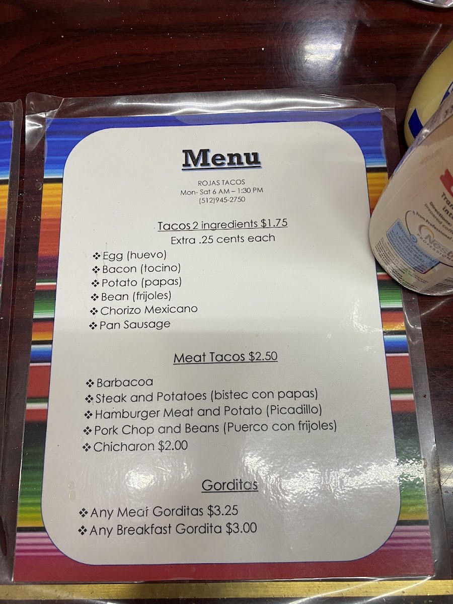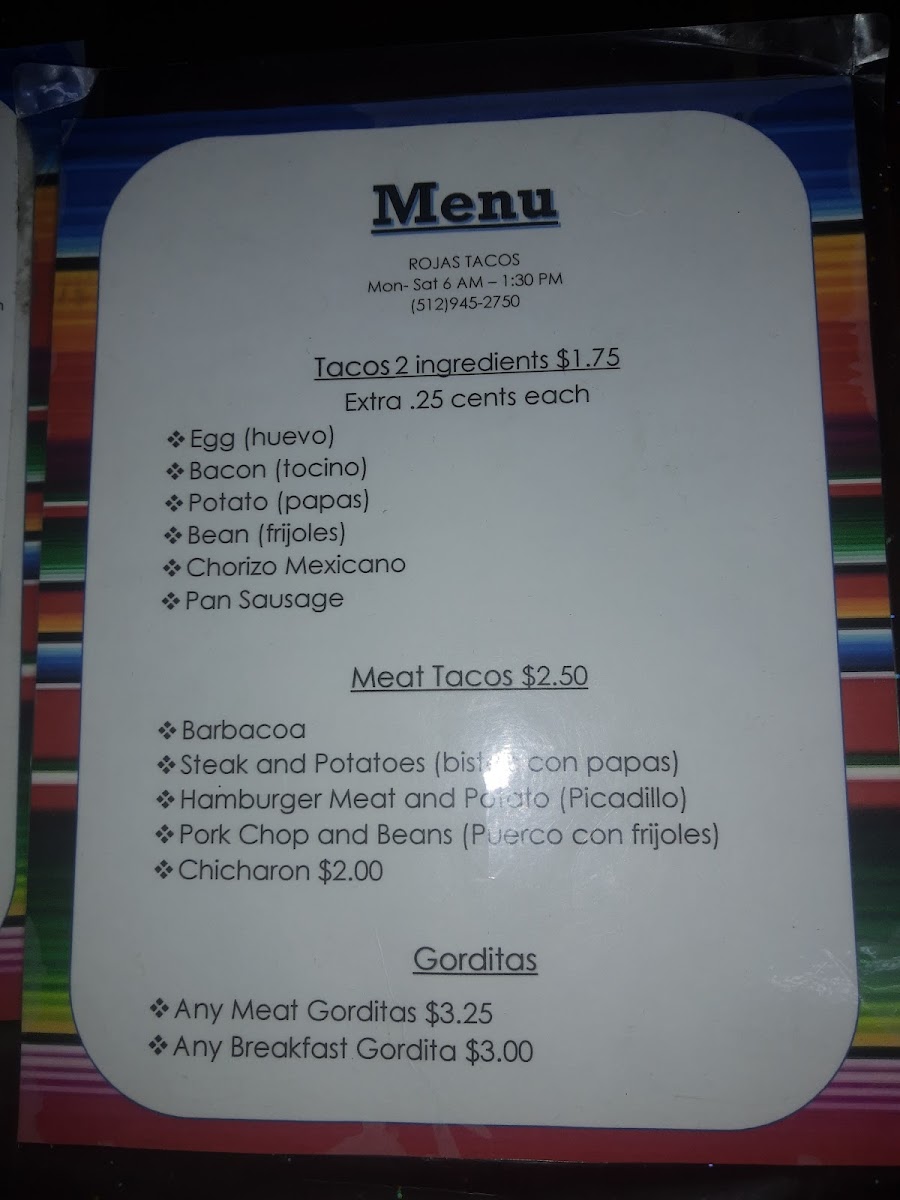 Rojas Tacos Menu